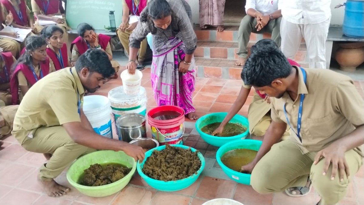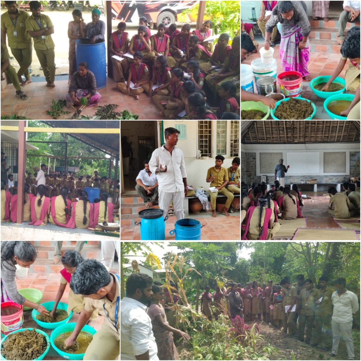 Next, we introduced the students to natural growth promoters such as Jeevamrutha, Panchagavya, fish amino acid, herbal insect repellents, and cow-based preventive medicine. These were shared within the broader framework of soil health and the critical role of microbes in building a living soil and breathing farm ecosystem.