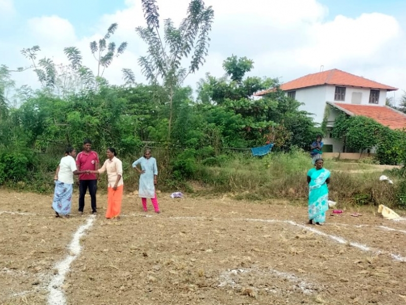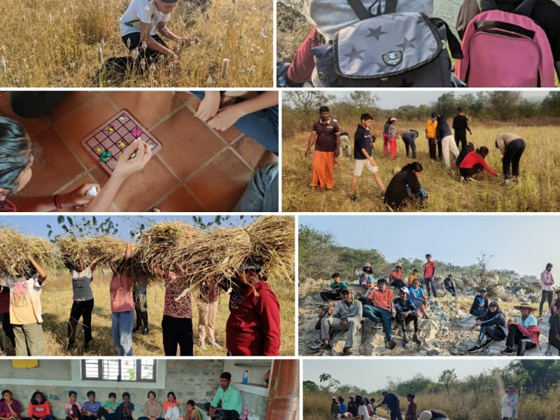 From February 5th to 9th, our Bhoomi Tiruvannamalai farm hosted a five-day residential camp for 20 students and 3 teachers from Tatva School, Chennai. During their stay, the students engaged in various farm activities, including harvesting horse gram, transplanting paddy, creating raised beds, and learning about different paddy varieties. They also had the opportunity to participate in traditional games workshops.