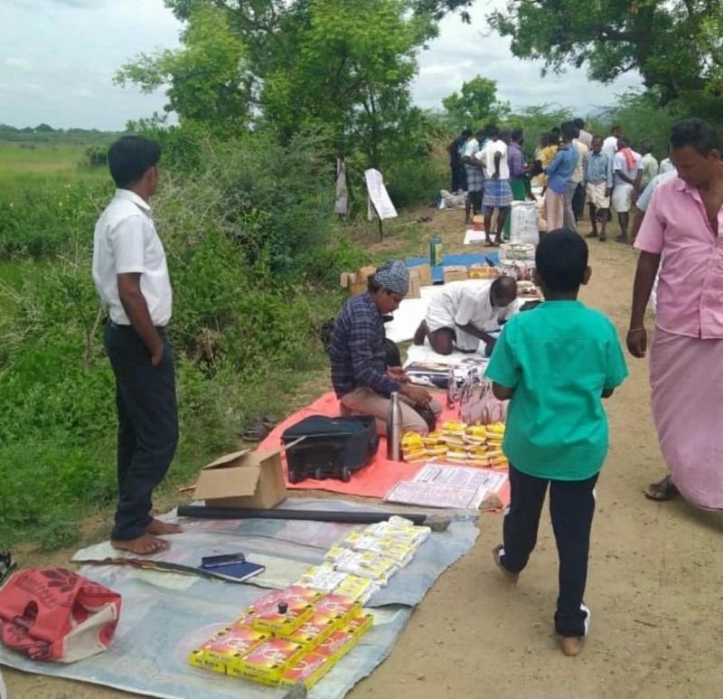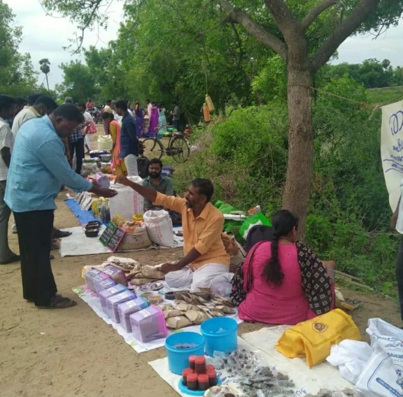 We have travelled nearly 60 kms from our Bhoomi farm in Chengam, Tiruvannamalai. It is 10 AM and the sun is ferocious. Gusty winds blow, signaling the arrival of Aadi month. It is the 5th of July today. I look outside. We have reached the Kaatu Kaaliamman temple, an old, neglected and almost-in-ruins temple. We park the Bolero (four-wheeler) and all of us get down. I am accompanied by 3 members of the women’s Self Help Group and Yoganathan, the farm assistant. All of them are excited because this is the first time Bhoomi is putting up a stall in the Kalasapakkam Santhe (Farmers’ market). What I had not told them was that today was extra special because it was the day of the seed festival.