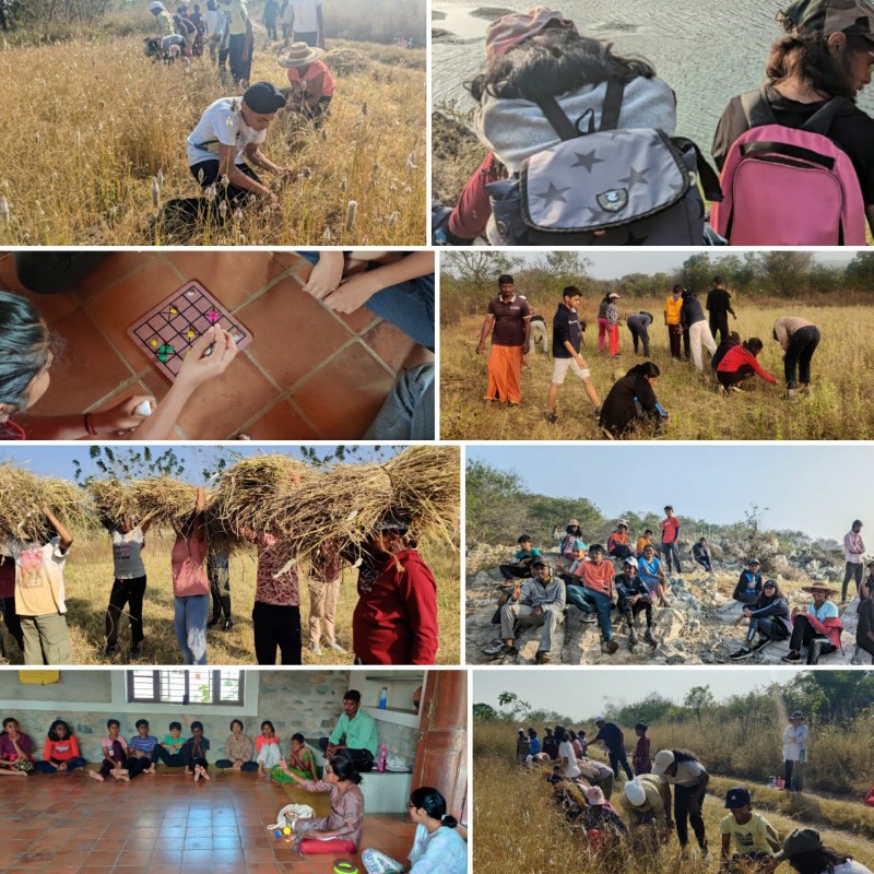 From February 5th to 9th, our Bhoomi Tiruvannamalai farm hosted a five-day residential camp for 20 students and 3 teachers from Tatva School, Chennai. During their stay, the students engaged in various farm activities, including harvesting horse gram, transplanting paddy, creating raised beds, and learning about different paddy varieties. They also had the opportunity to participate in traditional games workshops conducted by Ima ReCreations, a social enterprise. Additionally, the children interacted with a local organic farmer, gaining insights into the life of a farmer. Fun activities such as trekking to the river, village walks, team cooking, and bonfire nights were also incorporated into the experience. They embraced millet-based foods and the basic facilities at the camp with remarkable enthusiasm.